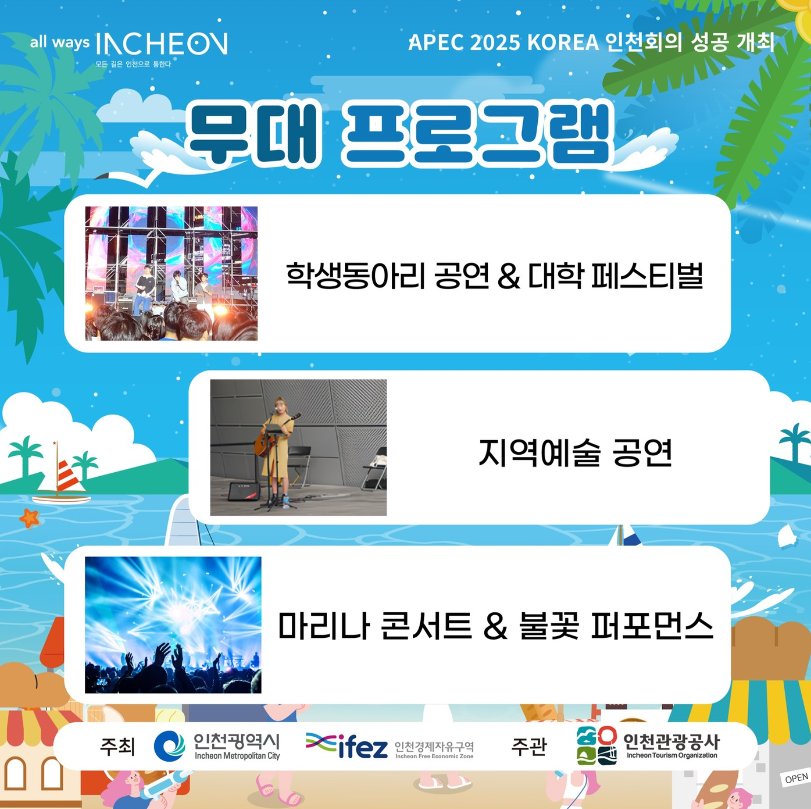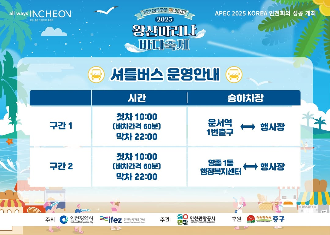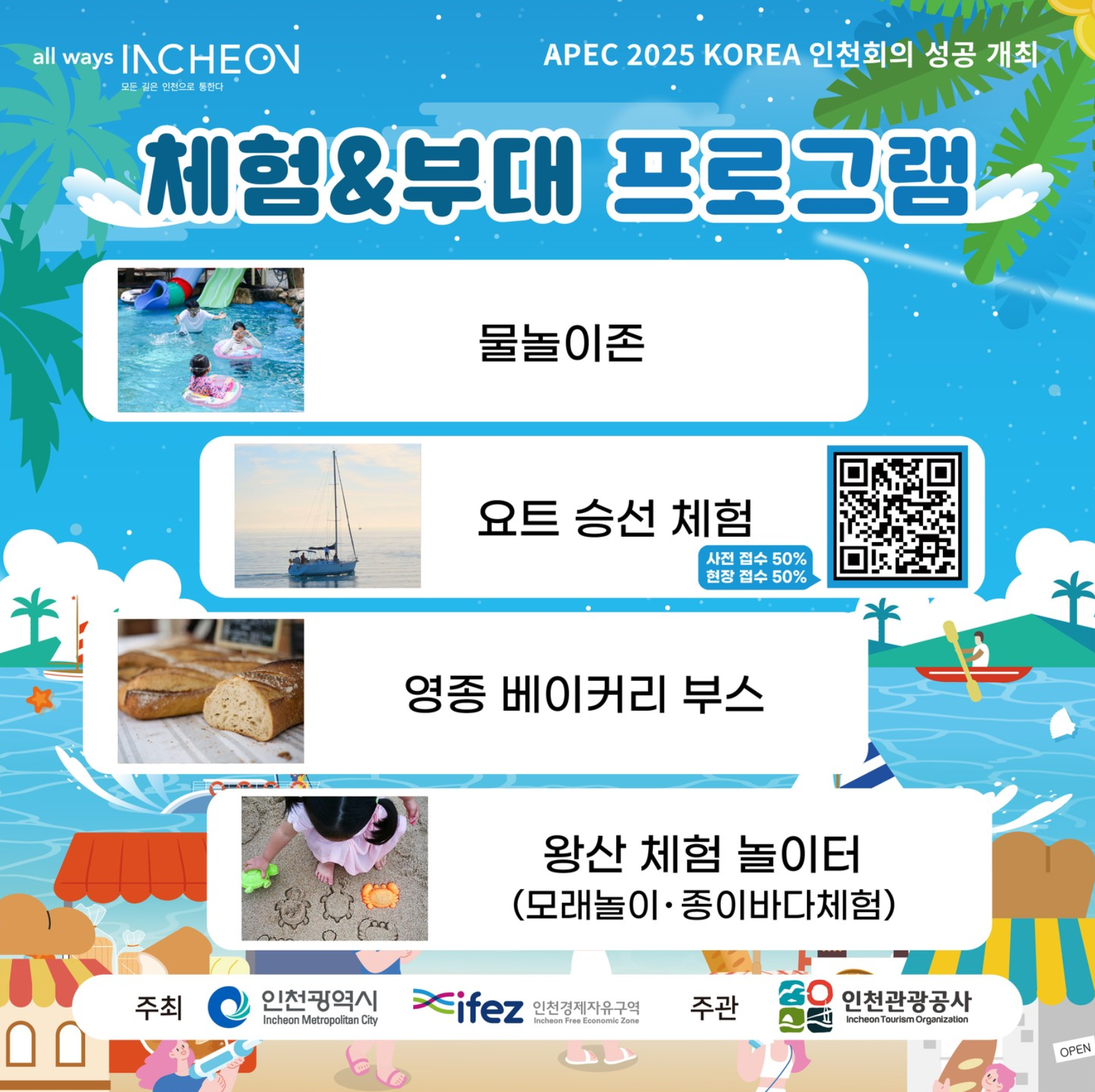 해양레저와 지역 문화, 여름 감성이 어우러진 영종국제도시의 대표 여름 축제! 인천경제자유구역청과 인천관광공사가 알차게 준비한 만큼, 하루 종일 지루할 틈 없이 즐거운 시간을 보낼 수 있을 것입니다.
