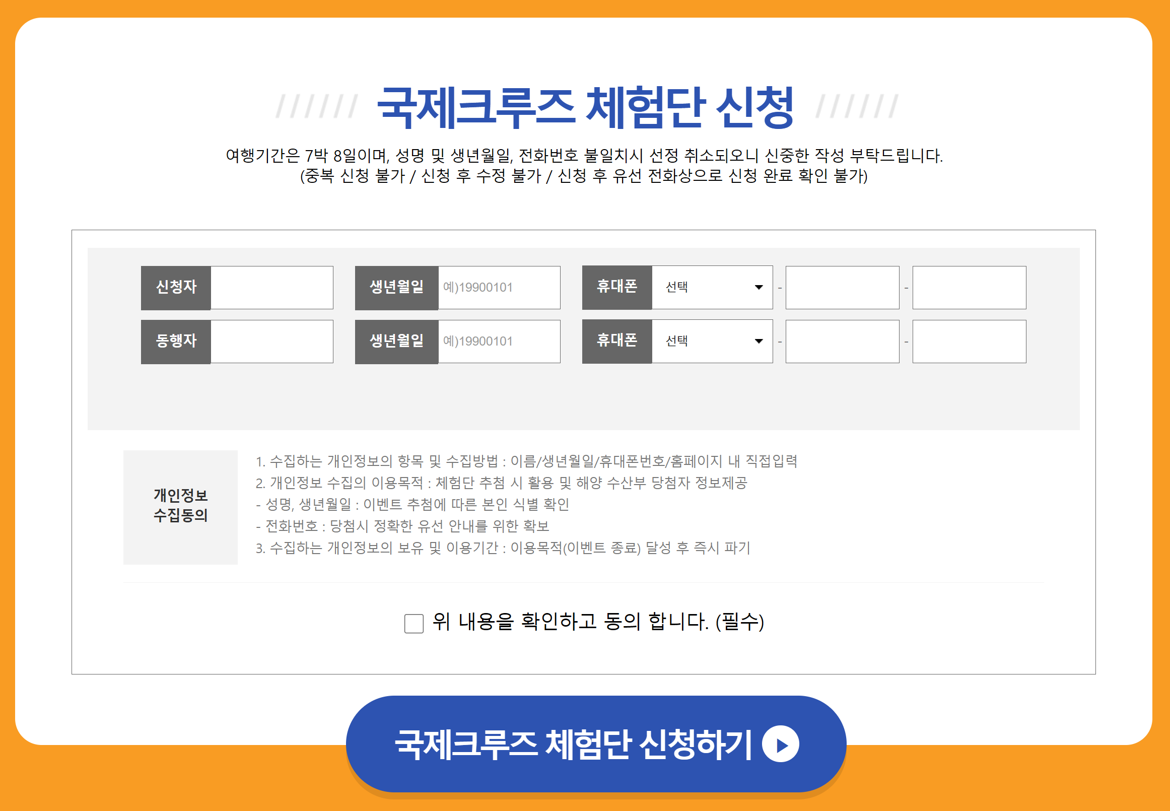 ※ 과거 해양수산부 크루즈 체험단에 선정되었던 분은 중복 참여가 불가능합니다.