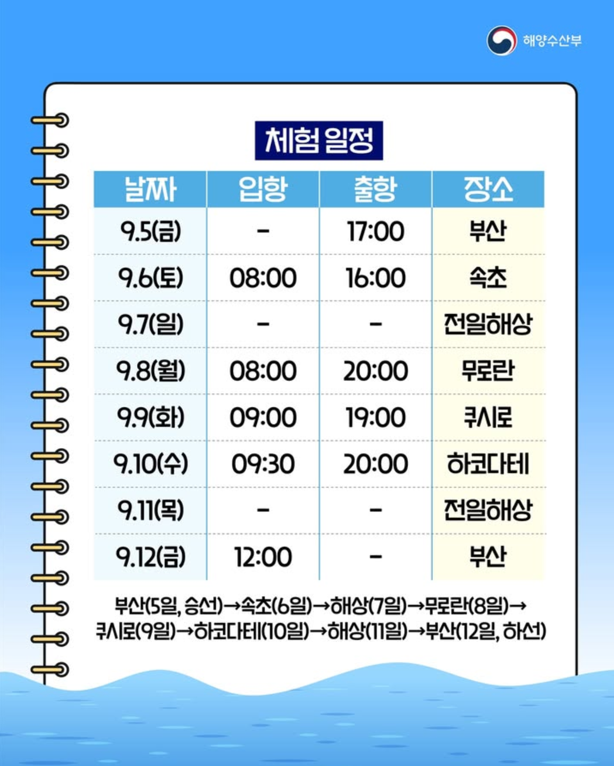 부산 승선 → 속초 → 해상 → 일본 무로란 → 일본 쿠시로 → 일본 하코다테 → 해상 → 부산 하선