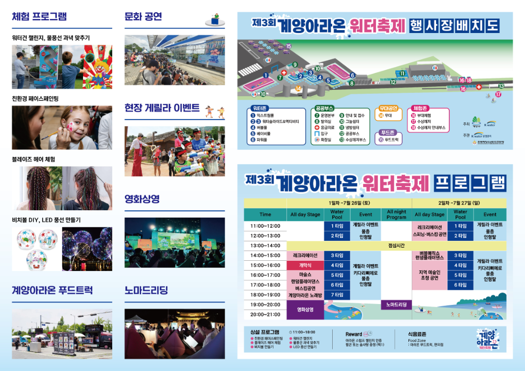 - 체험 부스: 워터건 챌린지, 블레이즈 헤어, 페이스페인팅 등 다양한 체험을 즐길 수 있습니다.
